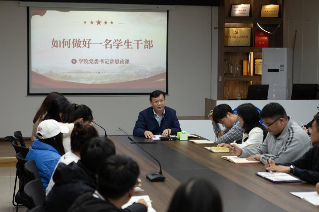 杨乃军结合自身学生干部经历、工作经验和心得体会,与学生深入交流,现场气氛热烈。他对学生们寄予了殷切厚望:一是强化理论武装,争做信仰坚定的表率。思想是行动的先导,理论学习是干事创业的力量源泉,指导实践的根本法宝学生干部要成长起来,必须坚定理想信念,加强理论武装坚持正确定位,争做知行合一的表率学生干部的第一身份是学生,把学习首要任务,在面对工作和学习的冲突时,要学会管理,做好角色之间的快速切换,提高学习与工作的效率。三是注重真抓实干,争做担当奉献的表率。要做学生友,不做学生官。要坚持以服务同学为宗旨,认真倾听学生诉求,实心实意帮助同学解决困难,及时向学院反映同学们的意见建议。四是不忘服务初心,做吃苦耐劳的表率。要干在实处,走在前列,既能当老黄牛,又能当火车头,吃得了苦,受得了挫折,耐得住寂寞,经得起考验,埋头苦干,默默奉献,真正在为同学服务中体现自我价值和人生意义。