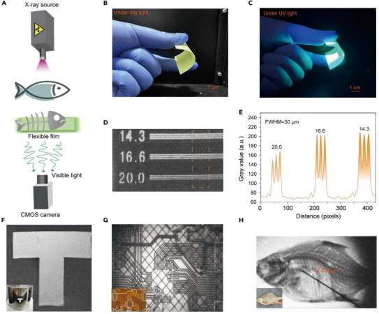 作者通过将金属-有机凝胶闪烁体与高分子材料结合制备了柔性的闪烁体屏幕。X射线成像实验表明,基于该柔性薄膜的成像系统实现了20 lp mm-1的高分辨X射线成像(图4)。