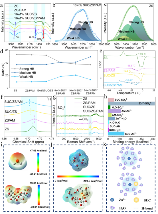 图1.水凝胶电解质体系中理论计算与光谱学表征。(a)ZS、ZS/PAM、16wt%SUC/ZS和16wt%SUC/ZS/PAM的FTIR光谱。(b)16wt%SUC/ZS/PAM和(c)ZS的拟合FTIR光谱。(d)不同水凝胶电解质中水的弱、中和强HB的面积比。(e)ZS、ZS/PAM、SUC/ZS和SUC/ZS/PAM水凝胶电解质的DSC曲线。(f)ZS、ZS/AM、SUC/ZS和SUC/ZS/AM电解液的1H NMR谱图。(g)ZS、ZS/PAM、SUC/ZS和SUC/ZS/PAM水凝胶电解液的拉曼光谱。(h)通过DFT模拟获得的H2O、SUC、SO42−、Zn2+和AM之间的结合能。(i)H2O分子和SUC分子的ESP。(j)原始Zn2+-6H2O和SUC-Zn2+-5H2O溶剂化结构的ESP。(k)Zn2+在ZS和SUC/ZS/PAM电解质中的溶剂化结构。