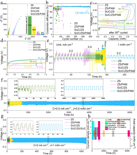 图3.基于Zn//Zn对称电池的稳定可逆沉积/溶解行为。(a)ZS、ZS/PAM和SUC/ZS/PAM水凝胶电解质的离子电导率。(b)Zn//Cu不对称电池的CE。(c)1 mA cm-2和1 mAh cm-2处的电镀和剥离电压曲线。(d)成核过电位Zn//Cu不对称池。(e)Zn//Zn对称电池在0.2-5 mA cm-2电流密度下的倍率性能。Zn//Zn对称电池在不同电流密度和面容量分别为(f)0.5 mA cm -2、0.5 mAh cm -2和(g)2 mA cm -2、1 mAh cm -2下的长期恒流充电/放电比较。(C是指电流密度,J是指面容量)(h)Zn//Zn对称电池的循环寿命与先前报道的值的比较。