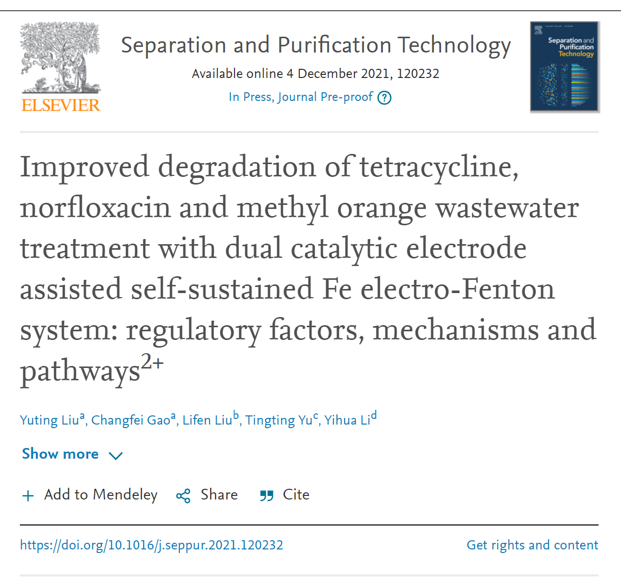 高常飞副教授课题组在Separation and Purification Technology 上发表了题为“Improved degradation of tetracycline, norfloxacin and methyl orange wastewater treatment with dual catalytic electrode assisted self-sustained Fe2+ electro-Fenton system: regulatory factors, mechanisms and pathways”的研究论文,在这项研究中,采用钛网作为基底的PbO2/SnO2阳极和不锈钢作为基底的Ag@ZOF阴极,并在溶液中引入牺牲铁阳极,实现了Fe2+的内源供应和有机废水的高效去除。通过SEM、XRD、XPS以及电化学分析等手段证明了催化剂的成功复合和电极优异的电化学性能。结果表明,在pH范围3.5-4.0、铁面积10 cm2、电流强度9 mA的优化条件下,该工艺能够自支撑产生H2O2和Fe2+,电流效率经计算高达92.37%。对四环素、诺氟沙星、甲基橙均有较好的降解效果,降解效率分别为99.1%、92.8%和100%。
