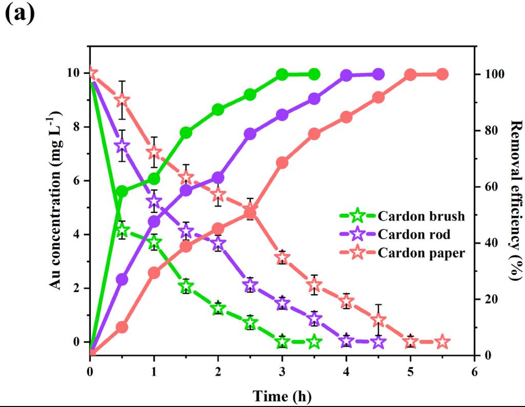 研究表明,BES系统可用于从重金属废水中回收有价金属(Au、Pt和Pd)并获得生物电。实验表明,BES系统对贵金属元素的去除率可达100%,回收效率可达93.3%。与电沉积相比,BES系统可以在处理和回收贵金属的同时回收电能。BES-EC耦合系统专为含有CN-和贵金属的实际混合废水而设计。证明贵金属废水中的氯离子在电化学催化下可实现氰离子的去除。