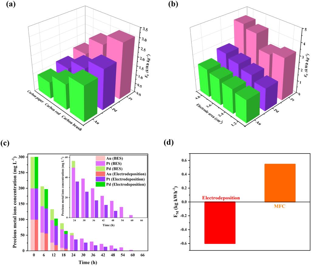 Fig. 5. Energy efficiency (a. anode and b. electrode area); (c) precious metal ions change in the cathode chamber (the initial concentration: Au, 100 mg L−1; Pt, 100 mg L−1; Pd, 100 mg L−1); (d) comparison of the energy efficiency of electrodeposition and BES.