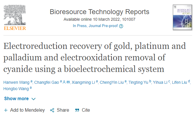 近日,我院高常飞副教授课题组在Bioresource Technology Reports上发表了题为“Electroreduction recovery of gold, platinum and palladium and electrooxidation removal of cyanide using a bioelectrochemical system”的研究论文。在碳电极耦合的生物电化学系统(BES)中对Au,Pt和Pd进行了电还原和电沉积回收。碳刷的总伏安电荷达到0.180 C cm−2。碳刷电极的活性位点多存在于电极表面,电荷转移电阻和碳刷生物膜的电阻仅为5.2 Ω和1.5 Ω。通过扫描电子显微镜、X射线光电子能谱和X射线衍射仪对电还原产物进行了分析。金、铂和钯的能效分别达到2.22 kWh−1,4.45 kWh−1和2.27 kWh−1,最大功率密度1.16 W m−2。探索了MFC耦合电解池的BES系统在氰化物尾矿浸出液处理中的工程应用潜力,同时实现了Au/Pt/Pd的电还原回收和氰化物的电氧化去除(CN−的去除效率100%)。