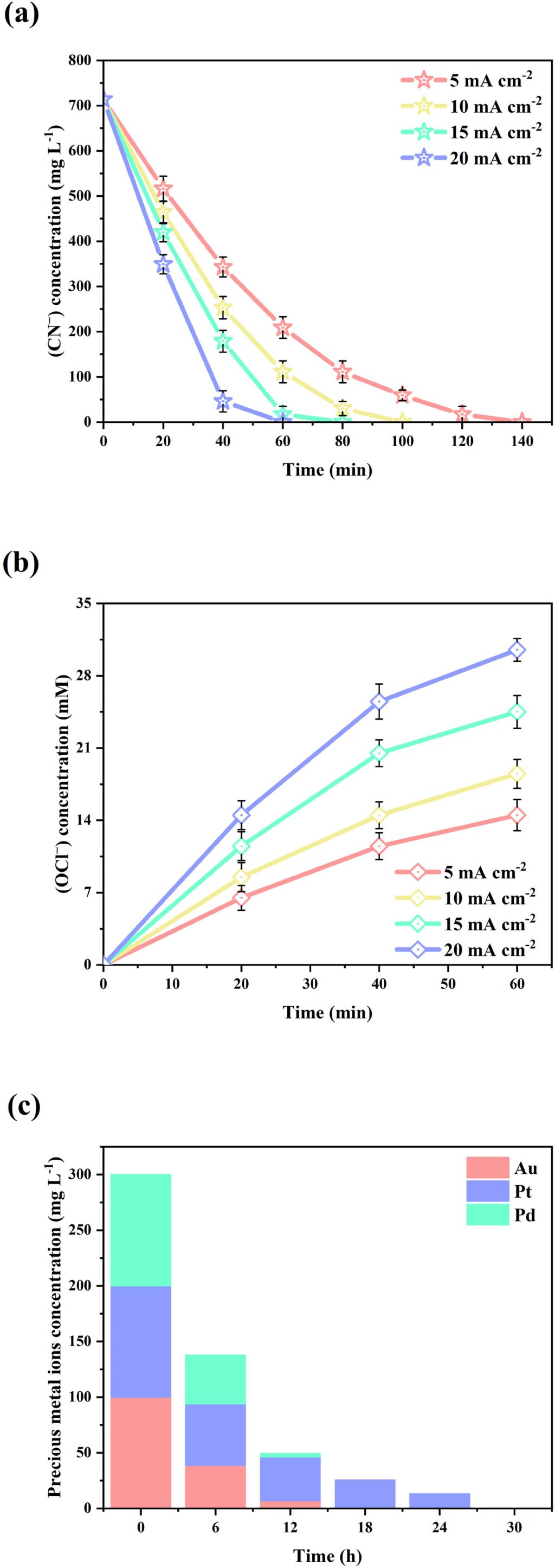 Fig. 6. Changes in the concentration of CN− (a) and OCl− (b) with time under different applied currents; (c) the curve of the concentration of precious metal ions in BES-EC with time under 20 mA cm−2.