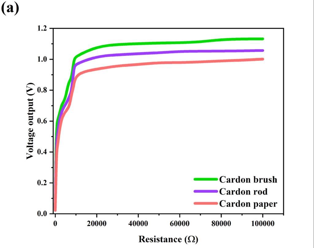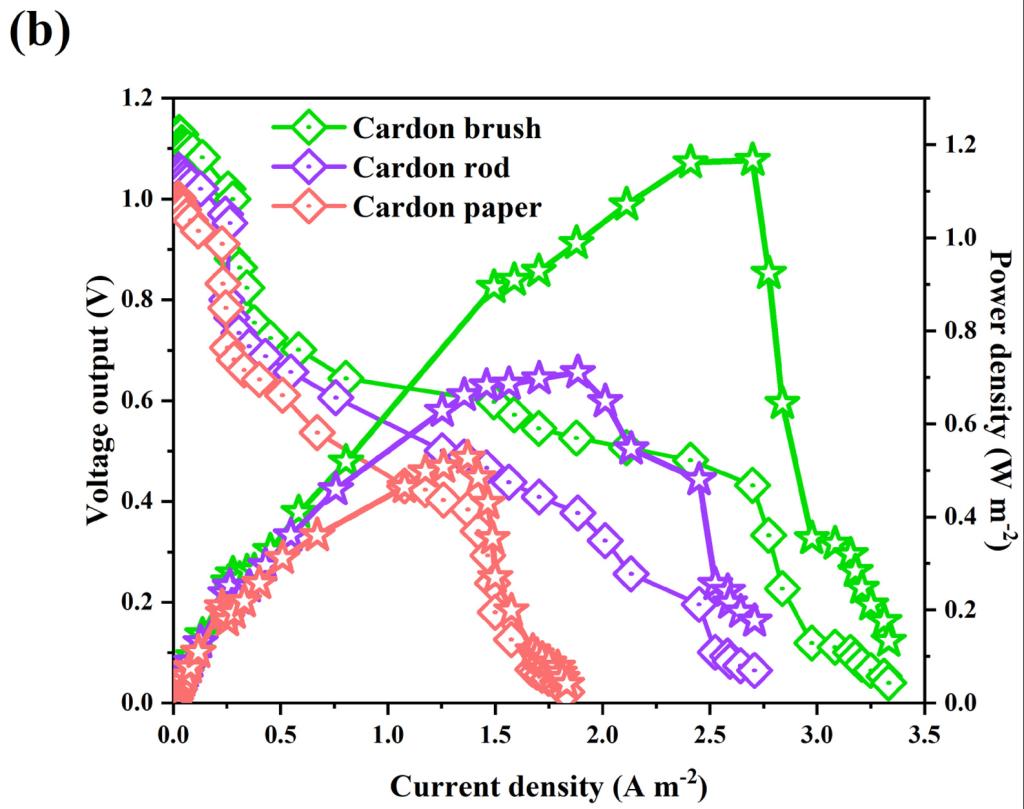 对带有不同阳极的BES进行了性能测试。将阳极细菌接种到反应器48h后,阳极电位稳定,表明细菌的活性和代谢正常。碳刷阳极(1.22V)的OCV明显高于其他两个电极(碳棒,1.12V;碳纸1.08V),这证明碳刷与BES相比可以显着提高BES的发电性能。BES的最大功率密度分别为1.16 Wm-2(碳刷)、0.71 Wm-2(碳棒)和0.53 Wm-2(碳纸)。