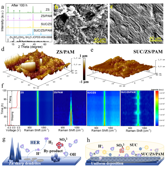 图2.对不同电解质体系中锌沉积过程和副反应的全面表征。(a)Zn负极在ZS、ZS/PAM、SUC/ZS和SUC/ZS/PAM水凝胶电解质中100 h后的XRD图谱。使用(b)ZS/PAM和(c)SUC/ZS/PAM的循环后Zn沉积形态的SEM图像。使用(d)ZS/PAM和(e)SUC/ZS/PAM的循环后的锌负极AFM图像。(f)在0.5 mA cm-2和0.5 mAh cm-2下沉积Zn过程中的原位拉曼光谱。(g)ZS和(h)SUC/ZS/PAM下Zn负极表面与电解质之间相应界面相互作用的示意图。