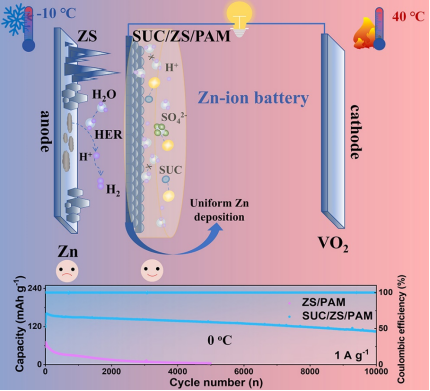 本研究提出了一种协同策略,通过在聚丙烯酰胺(PAM)水凝胶电解质中添加蔗糖(SUC)来提升锌负极的稳定性。PAM提供了良好的机械强度和弹性,其带负电的-NH2基团可限制自由水活性,降低冰点并促进Zn2+均匀沉积。SUC作为非牺牲型添加剂,通过改变Zn2+溶剂化结构和破坏水分子间的HBs网络,进一步抑制了枝晶形成和副反应。