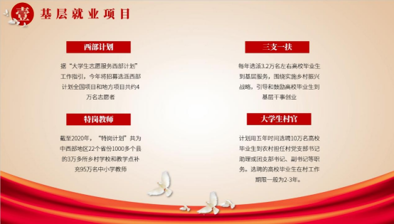 大学生志愿服务西部计划:号召毕业生到西部基层开展为期1—3年的教育、卫生、农技、乡村振兴等志愿服务,谱写奉献西部的青春之歌。