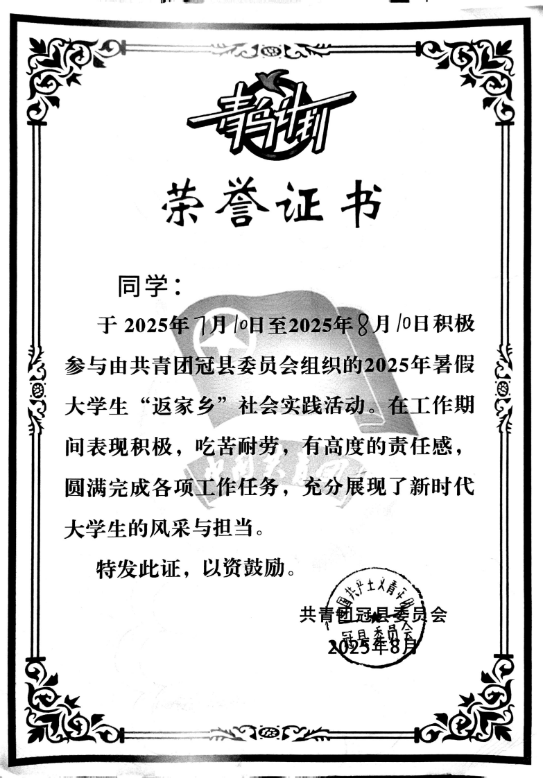 2025年盛夏,我参与青鸟计划,在淄博市临淄区政府社会工作部开展为期一个月的实践,获评淄博市大学生暑期社会实践优秀等次。在前辈指导下,我投身档案整理、数据核对、社区调研等基层工作。这些看似琐碎的事务,让我真切体悟到社会工作“以人民为中心”的温度,更懂得基层工作离不开严谨细致、脚踏实地的态度。这段实践不仅锻炼了我的沟通能力,更在我心中锚定了“扎根基层、服务社会”的方向。未来,我愿以青春之力,为家乡发展添砖加瓦。
