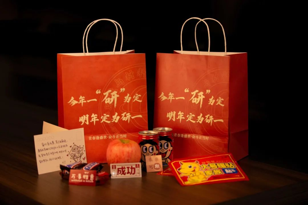 “考研暖心大礼包”由苹果、旺仔牛奶、士力架、巧克力饼干、暖宝宝、励志贴纸组成。苹果寓意“苹”步青云,“苹”安上岸;旺仔牛奶寓意生活旺、学业旺、考试旺;士力架寓意能量满满,活力无限;暖宝宝寓意驱散寒冷,暖心相随。低年级同学也为学长学姐手绘贺卡,一封封满载着祝愿、寄托着期许。