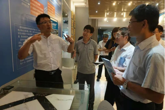 盛业军在展会上向大家介绍产品(PS:陶瓷分为日用陶瓷、艺术陶瓷和工业陶瓷,瓷砖属于工业陶瓷中的建筑陶瓷)